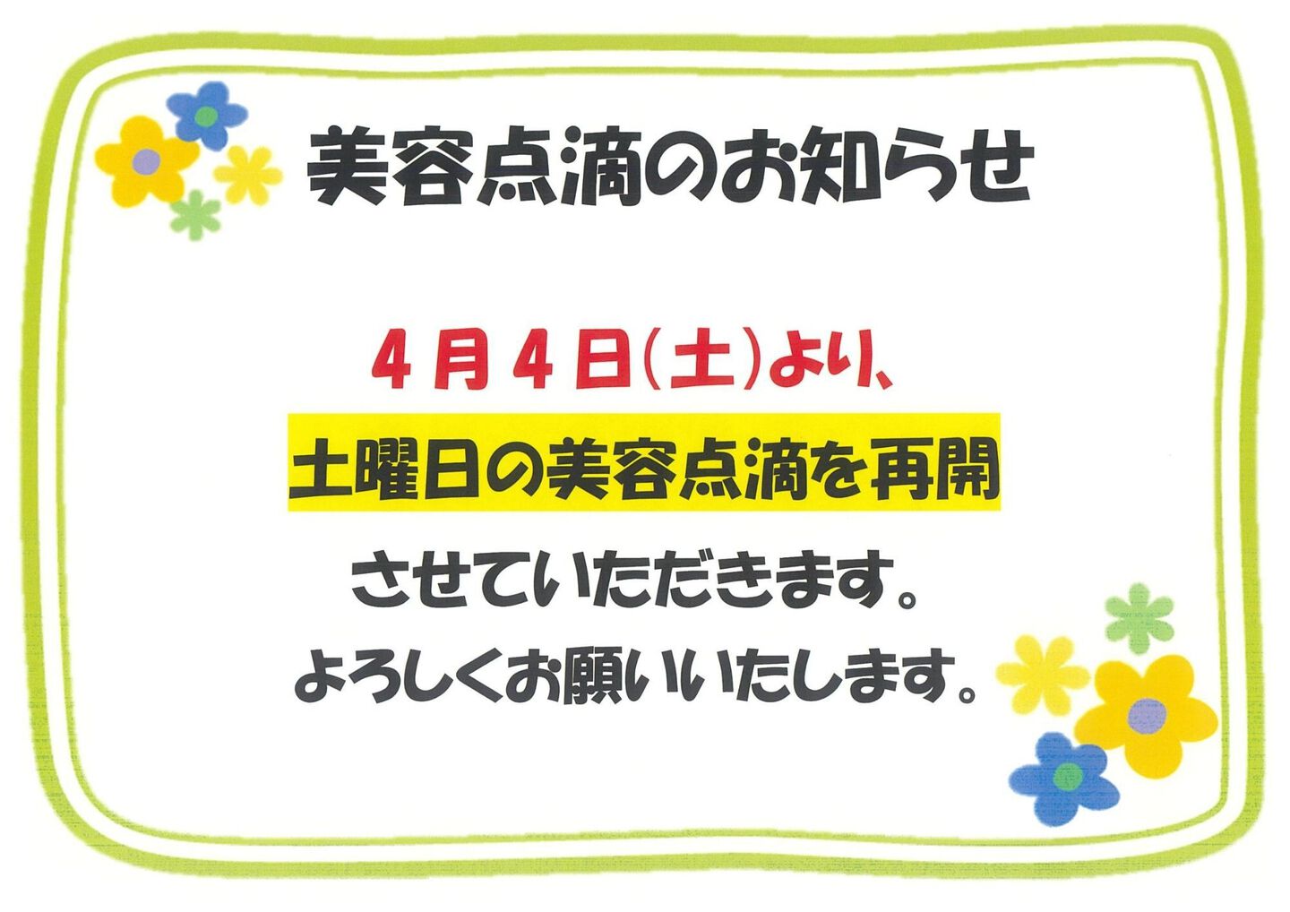 | 2020/3/2 | 本日から美容点滴半額感謝祭を実施しています。3月12日(木)まで。この機会に、ぜひご利用ください。 |